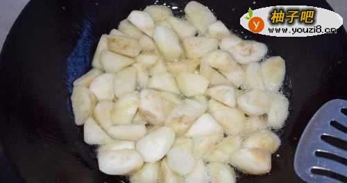 33,锅中入油,下茄子炸熟,捞起控下油,这里的油可以用来炒其他的菜。