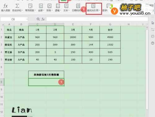 2选择单元格【C8】,点击【公式】—【查找与引用】;
