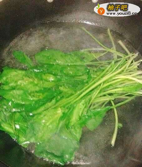 3锅中烧水,水开后放入择洗干净的菠菜焯水40秒,捞出过凉