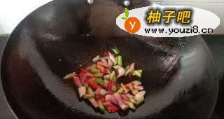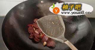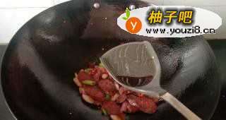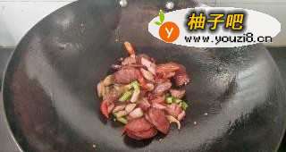 6放入香肠轻轻翻炒几下。