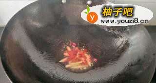 4锅中油热放入姜、小米椒和干辣椒煸香。