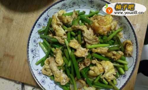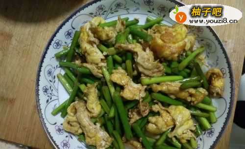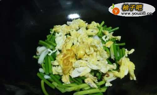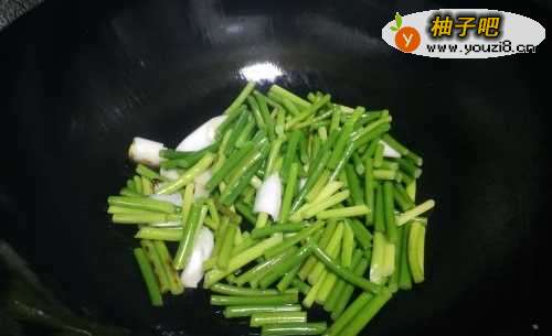 4起锅烧油,加入蒜苔爆炒,用大火翻炒1分钟。