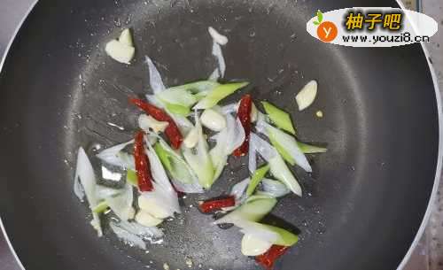 2然后,将锅烧热倒入适量的食用油,待油温热后,放入葱蒜和干辣椒小火炒出香味。如下图所示