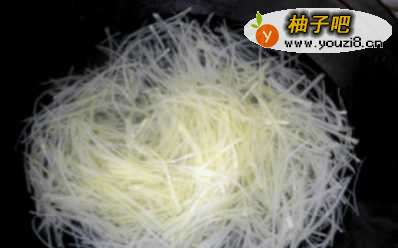 4用凉水冲洗焯过水的土豆丝,焯过水的土豆丝经凉水冲洗后会更加脆嫩爽口,控干水分