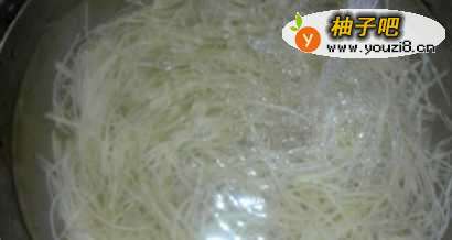 3锅内入水,水开后,放土豆丝稍微烫一下,最多一分钟