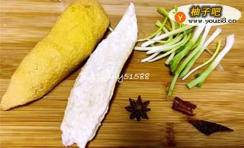 4将辅料桂皮,干柚子皮,八角,葱白准备好备用。