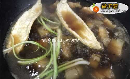 8加入适量的开水,放入桂皮,八角,干柚子皮,葱白,加入盐,老抽烧5分钟。
