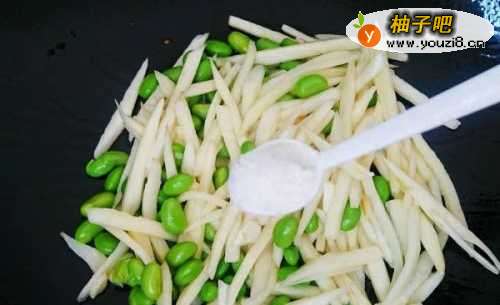 4热锅倒油,放入蒜末爆香后,下入茭白丝翻炒至软,然后倒入煮好的毛豆一同翻炒。