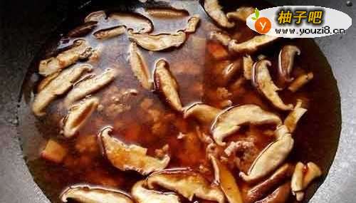 3加入豆瓣酱与酱油炒香后,囊排加入鱼板、香菇、高汤及水,盖上锅盖煮至滚。