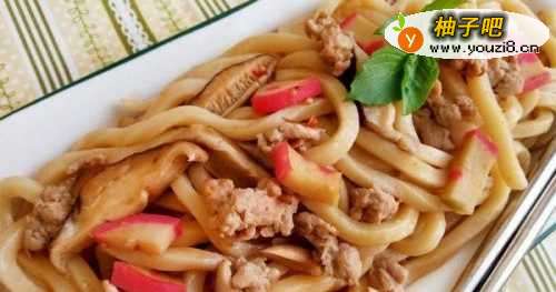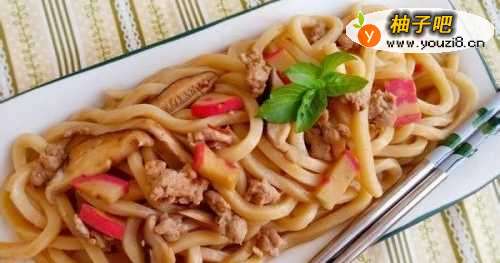 自制冷冻食品包趴兔~ 先用酱炒绞肉带出香气,再搭配乌龙面好朋友~鱼板与香菇,以柴鱼高汤为基底,让乌龙面味道更鲜!(3人份,1人份约400大卡)。