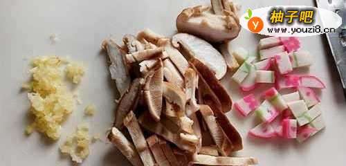 蒜切成末、鱼板切成小块、香菇切成小片备用。戴够敏