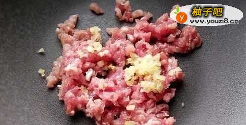 2不沾锅中直接放入绞肉与蒜末,中小火炒至绞肉半熟。