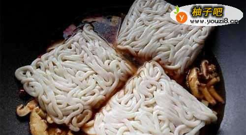 4放入乌龙面块,盖上锅盖闷煮一下让面条稍微软化后拌开,再续煮约3分钟至面软熟。