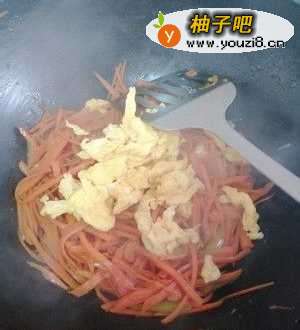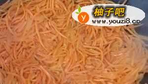 4放入胡萝卜,翻炒几下放入生抽,鸡精,炒至八九分熟。