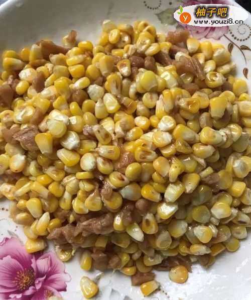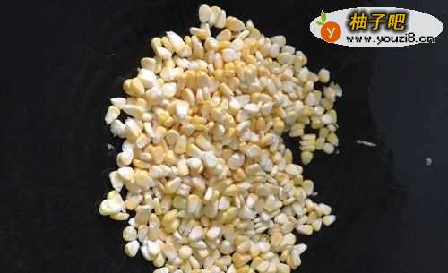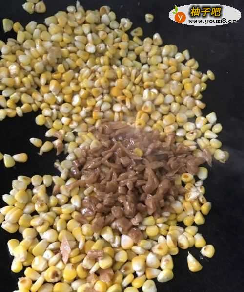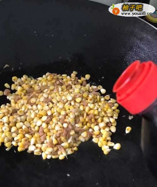 4剩下的油,用来炒玉米。把玉米粒倒进去,翻炒,放入适量的盐,继续翻炒。