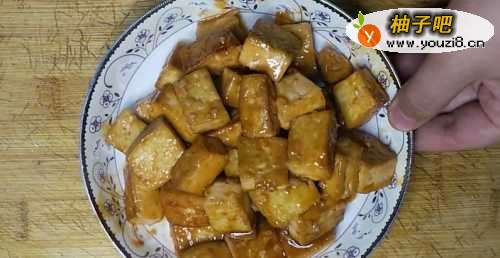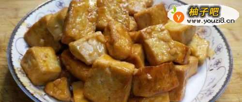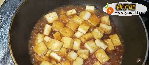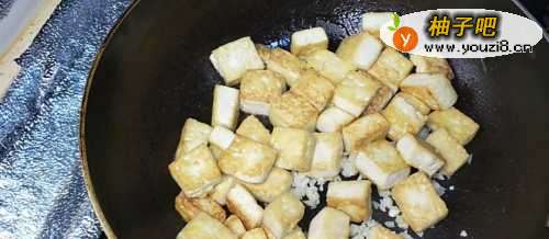 3、起锅烧油放入豆腐煎至金黄,放料汁焖煮。