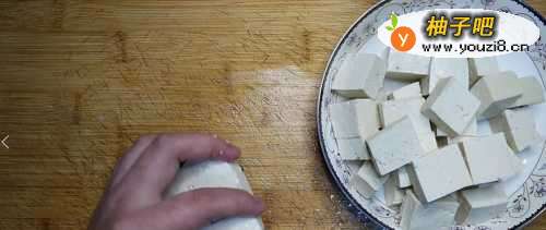 1、先把豆腐切成小块、蒜瓣剁成蒜末。