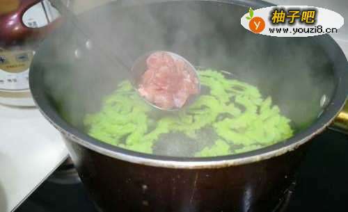 33.热水烧开,把苦瓜片放入,搅拌均匀。
