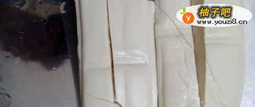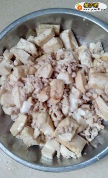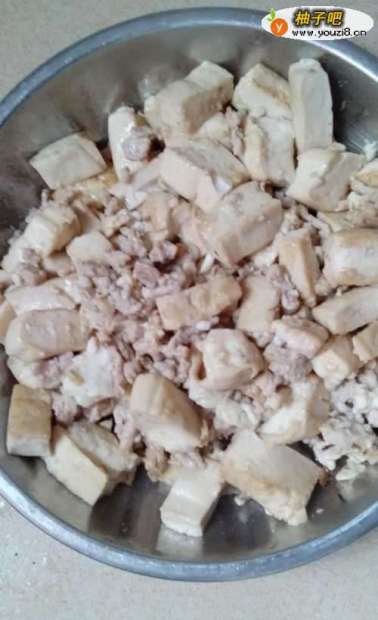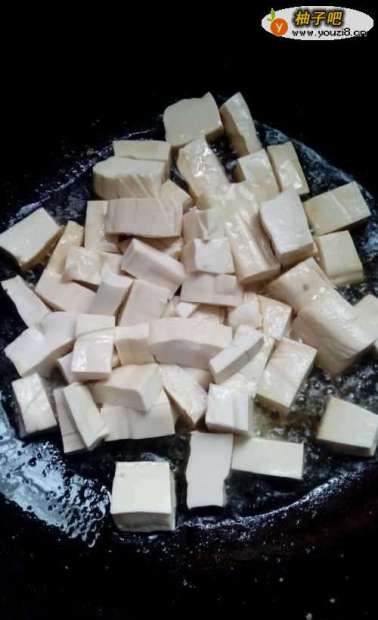 5锅内热油倒入小正方体状块豆腐,炒至快熟加入肉粒,一起炒约3分钟至熟