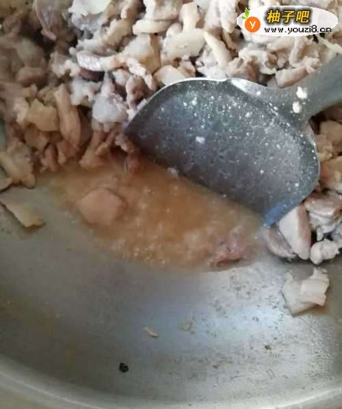 3几分钟后肉里的水和油会渗出(浑浊),继续翻炒至水消失只剩油(清澈),且肥肉部分透亮。