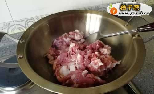2待油热后倒入肉,翻炒到红色的肉逐渐变白