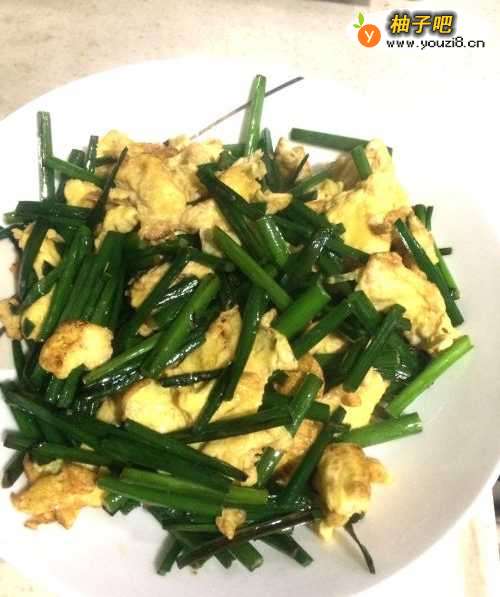 7韭菜苗炒至变色后加入炒好的蛋块;