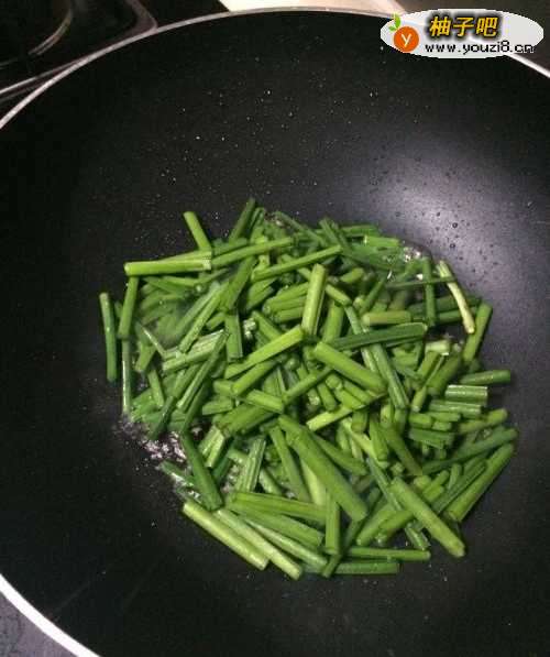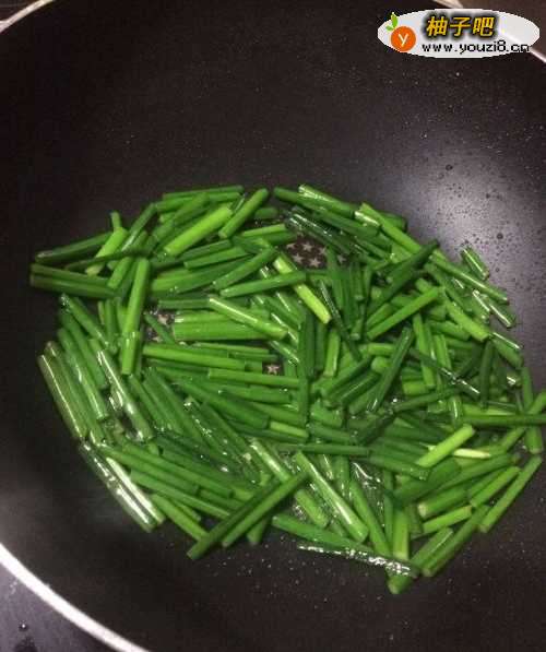 6把切小的蛋块盛出,锅里再次倒入油、韭菜苗;