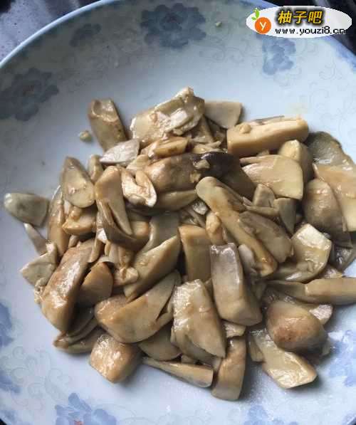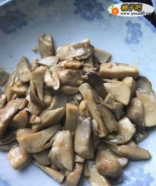5直到锅里的汤汁快收完,加入点点酱油,翻炒均匀即可上盘。由于草菇烫过水,已经差不多熟了,第二次下锅炒就不用煮太久。