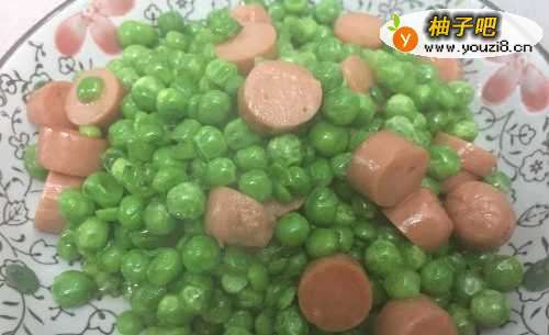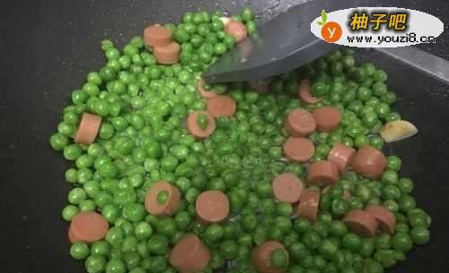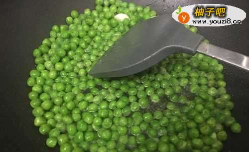 4倒入青豆,炒至亮绿色即可。