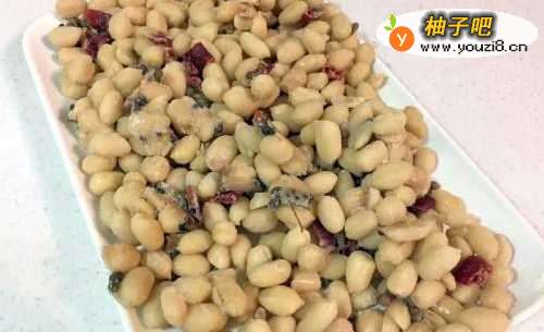 3取出浸泡入味的花生米去皮,连同浸泡过的辣椒、花椒等一起沥干后放冰箱冷冻约8小时