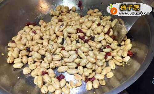 5放入花生、辣椒、花椒等,用小火边炸边翻动,炸至微微金黄色即可起锅沥干油