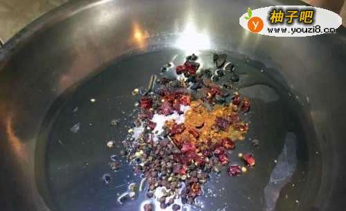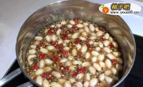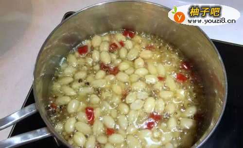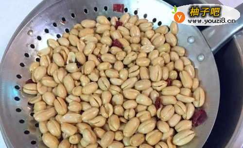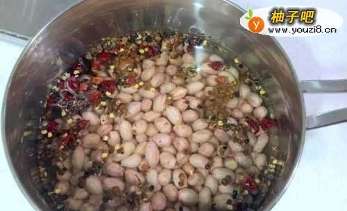 花生米清洗干净,加入浸泡的所有食材一起由冷水开始煮到沸腾后熄火