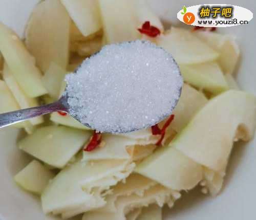 5将两汤匙的白糖撒到木瓜片中。