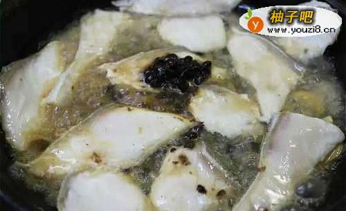 3等到鱼肉反白后,再把1/3碗水和一大匙豆鼓酱加进锅中,转小火盖锅盖闷一下