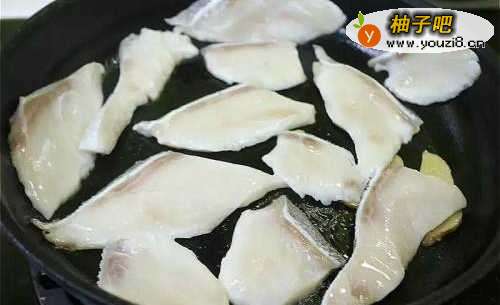 2先爆香姜片后,再下鱼片,不重叠中火煎香