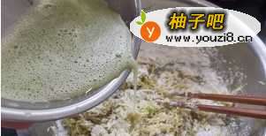 7如果盆里还有很多干面粉,丸子不成团儿,就加点萝卜汁,一点点的倒,边倒边搅。(这次,我大约加了15克萝卜汁。每个人挤萝卜汁时的力度不同,有可能不需要加萝卜汁。)