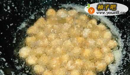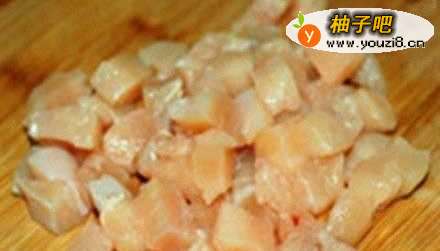 6油烧至六成熟,下入鸡肉丁,炸至表面金黄