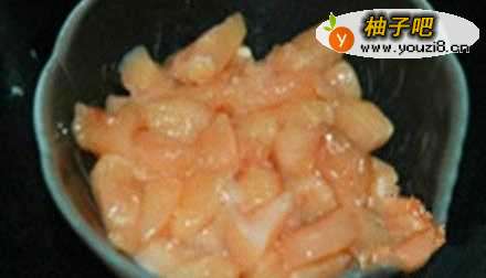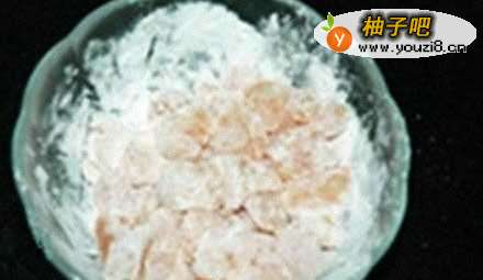 3腌好的鸡肉丁倒进装淀粉的碗里,沾一层淀粉
