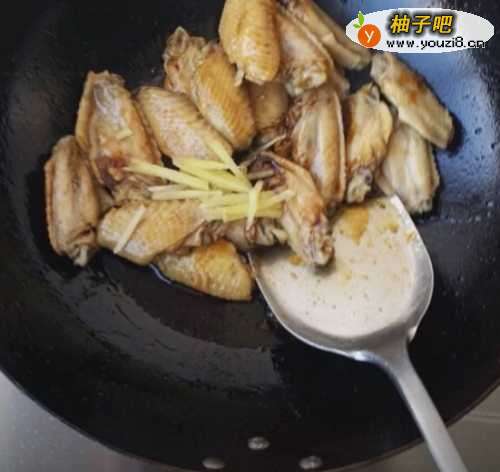 6最后我们再将鸡翅倒入锅里,把鸡翅炒到有红色,也不要炒的太的熟,火候控制好,小火就好,放入生抽,酱油,姜丝,料酒,