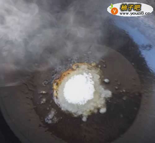 5准备好锅,在锅里面放入少量的油,把油烧热了,然后再将白砂糖放入锅里,烧起泡至白糖起色了,