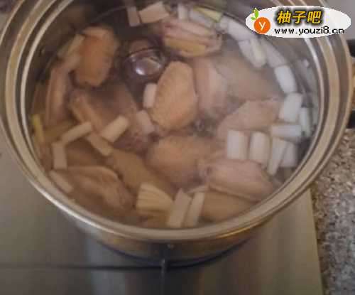 2再吧刚才洗好的鸡翅放入锅里,用大火烧开,