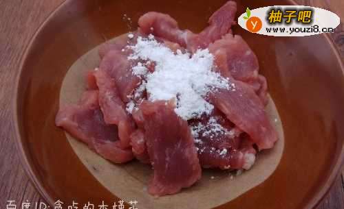 瘦肉洗净切成片,然后加入少量芡粉,再加少量清水拌匀