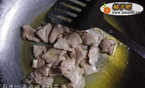5锅中加入适量植物油烧热,倒入肉片翻炒至变色,然后盛入碗里备用