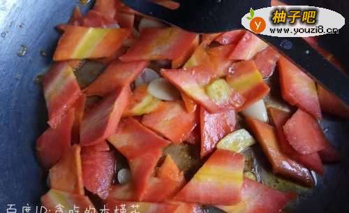 6锅中再加入少量植物油烧热,放入姜片、蒜片爆香,然后放入胡萝卜翻炒1分钟