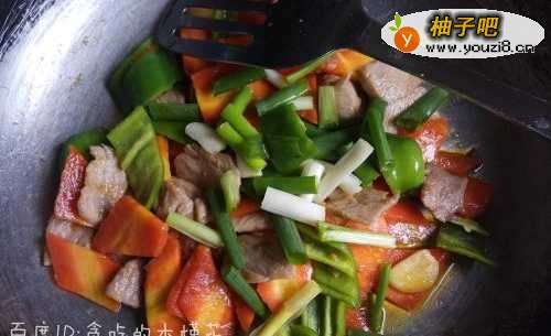 7把炒好的肉倒入锅中和胡萝卜一起翻炒2分钟,再倒入青椒、葱段继续翻炒。调入适量盐、生抽,少量鸡精翻炒几下就可以出锅了