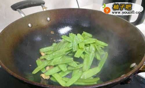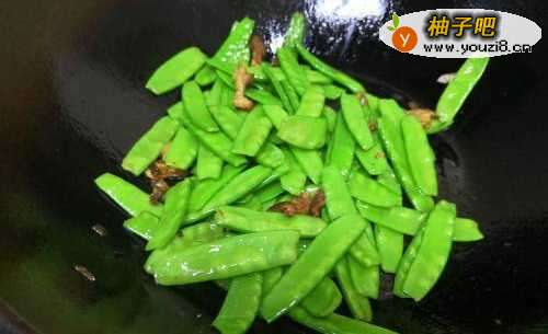 44.放入豌豆角,进行大火翻炒。