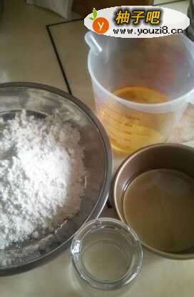 2蛋糕粉,黄油,玉米油,软化糖浆混合,直至混合成下图的样子