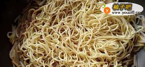 3倒入油面条,用筷子拨散后盖上锅盖,小火闷煮约3分钟。