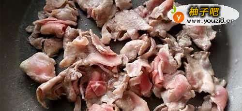 不沾锅中直接倒入火锅猪肉片,炒至半熟出油后,盛起备用。