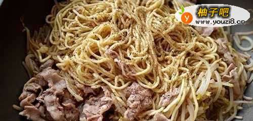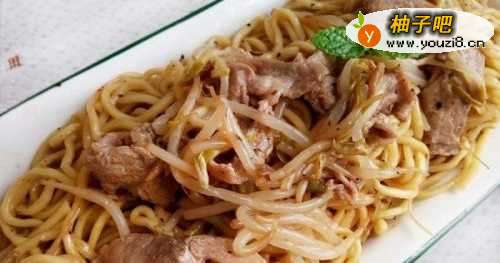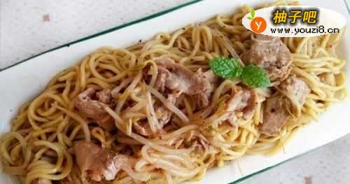 1.不沾锅中直接倒入火锅猪肉片,炒至半熟出油后,盛起备用。2.原锅倒入豆芽菜翻炒,加入水与蘑菇酱,盖上锅盖以中小火煮至水滚。3.倒入油面条,用筷子拨散后盖上锅盖,小火闷煮约3分钟。4.加入步骤(1)的猪肉片,洒上适量黑胡椒粒及白胡椒粉。5.上盖闷煮一下让猪肉熟透,再将面料拌炒均匀。